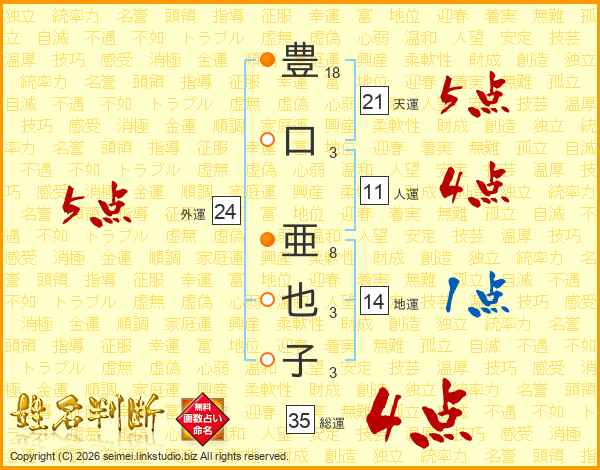 豊(18画)口(3画) 亜(8画)也(3画)子(3画)