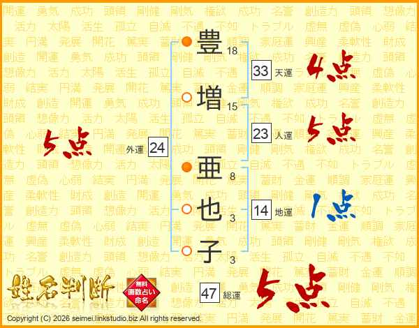 豊(18画)増(15画) 亜(8画)也(3画)子(3画)