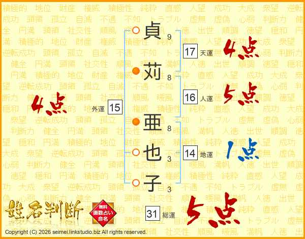 貞(9画)苅(8画) 亜(8画)也(3画)子(3画)