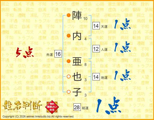 陣(10画)内(4画) 亜(8画)也(3画)子(3画)