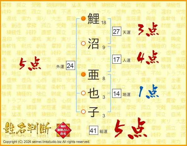 鯉沼亜也子さんの総運は41画の5点!