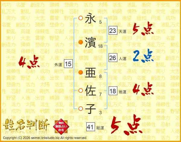 永(5画)濱(18画) 亜(8画)佐(7画)子(3画)