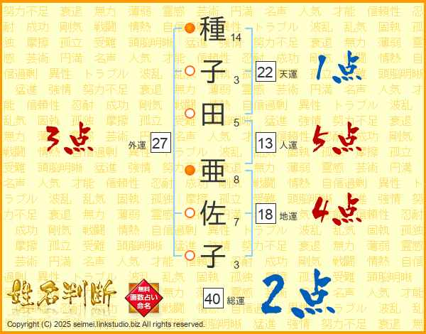種(14画)子(3画)田(5画) 亜(8画)佐(7画)子(3画)