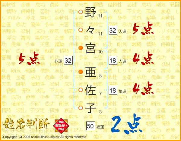 野(11画)々(11画)宮(10画) 亜(8画)佐(7画)子(3画)