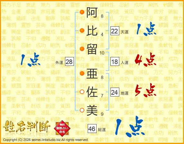 阿(8画)比(4画)留(10画) 亜(8画)佐(7画)美(9画)