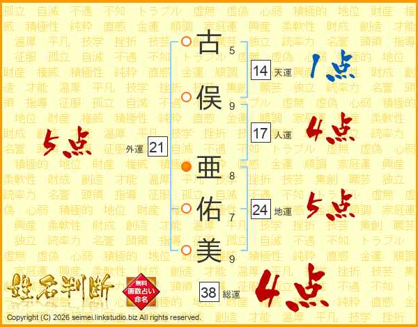 古(5画)俣(9画) 亜(8画)佑(7画)美(9画)