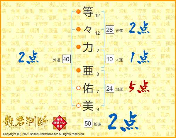 等(12画)々(12画)力(2画) 亜(8画)佑(7画)美(9画)