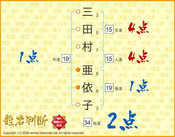 三(3画)田(5画)村(7画) 亜(8画)依(8画)子(3画)