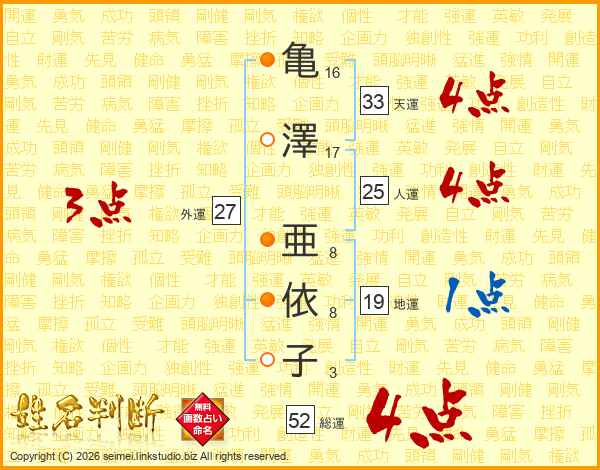 亀(16画)澤(17画) 亜(8画)依(8画)子(3画)