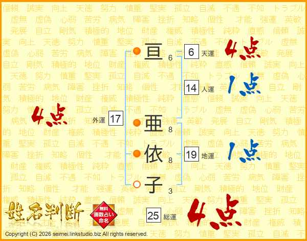 生活面を象徴する運勢です。外部から受ける影響力を表し、結婚運、家庭運や職場、環境への順応性を表します。総運から人運を引いた画数。姓や名が1文字の場合を除く。