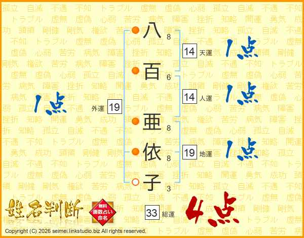 八(8画)百(6画) 亜(8画)依(8画)子(3画)