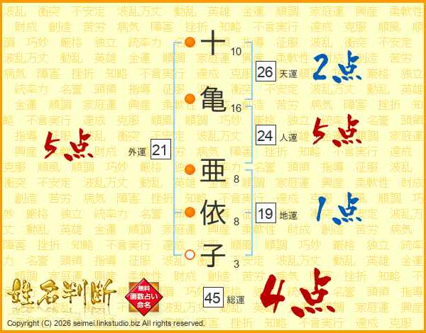 十(10画)亀(16画) 亜(8画)依(8画)子(3画)