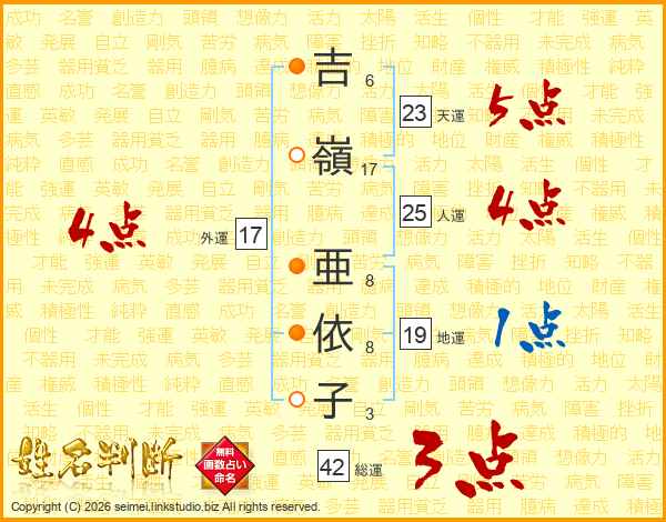 吉(6画)嶺(17画) 亜(8画)依(8画)子(3画)