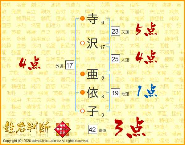 寺(6画)沢(17画) 亜(8画)依(8画)子(3画)