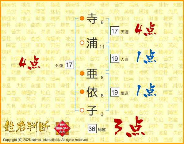 寺(6画)浦(11画) 亜(8画)依(8画)子(3画)