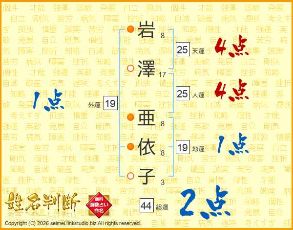 岩(8画)澤(17画) 亜(8画)依(8画)子(3画)