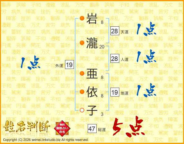 岩(8画)瀧(20画) 亜(8画)依(8画)子(3画)