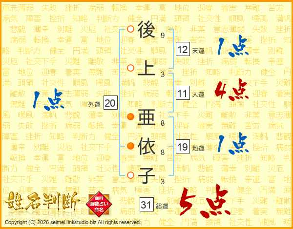 後(9画)上(3画) 亜(8画)依(8画)子(3画)