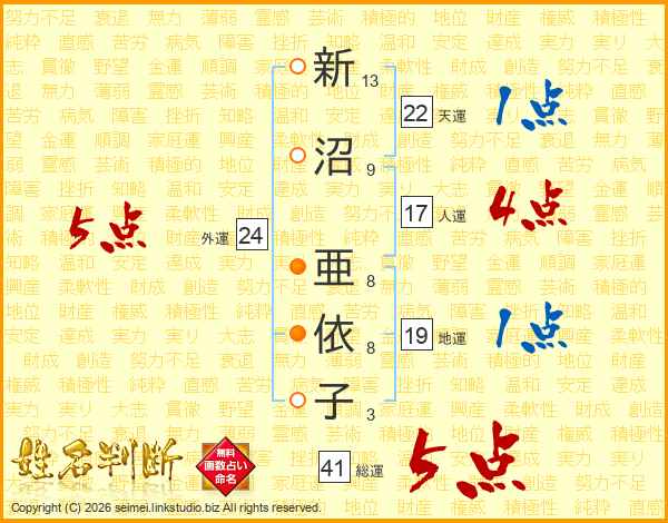 新(13画)沼(9画) 亜(8画)依(8画)子(3画)