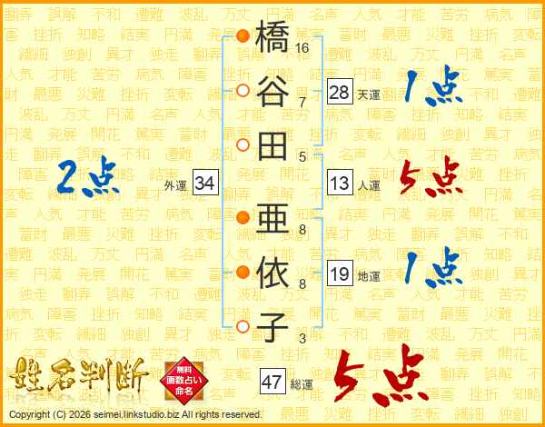 橋(16画)谷(7画)田(5画) 亜(8画)依(8画)子(3画)