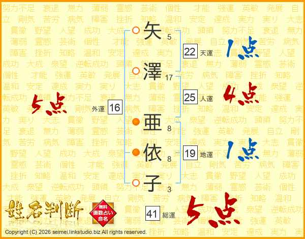矢(5画)澤(17画) 亜(8画)依(8画)子(3画)