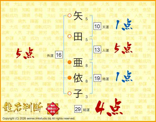 矢(5画)田(5画) 亜(8画)依(8画)子(3画)