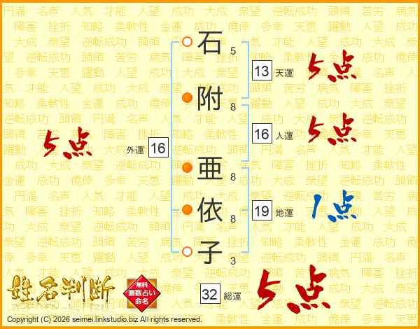 石(5画)附(8画) 亜(8画)依(8画)子(3画)