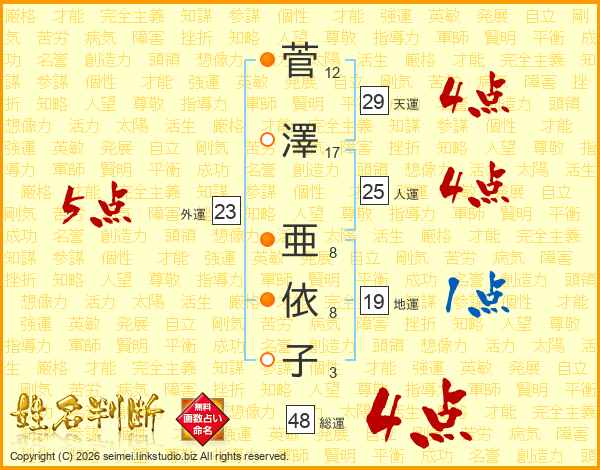 菅(12画)澤(17画) 亜(8画)依(8画)子(3画)