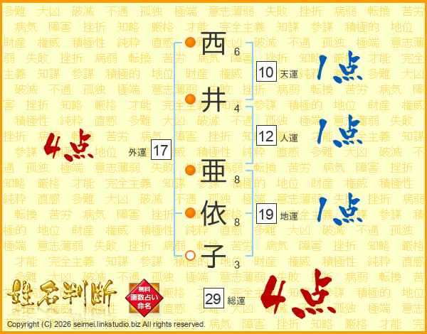 西(6画)井(4画) 亜(8画)依(8画)子(3画)