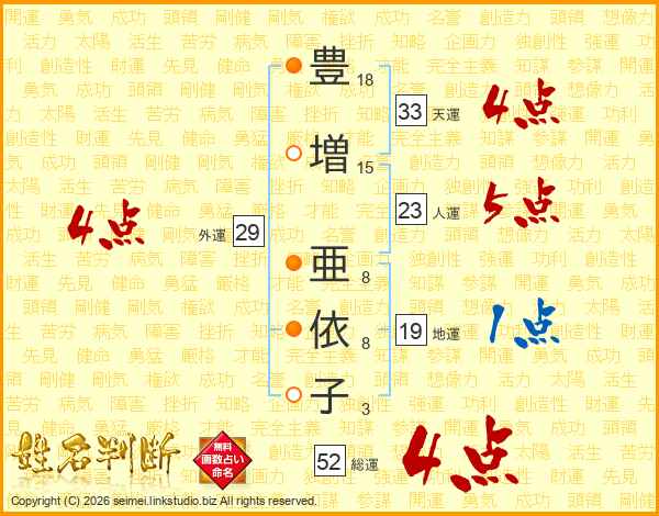 豊(18画)増(15画) 亜(8画)依(8画)子(3画)