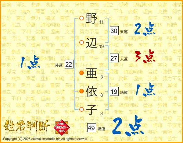 野(11画)辺(19画) 亜(8画)依(8画)子(3画)