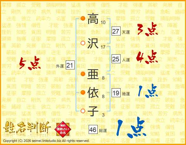 高(10画)沢(17画) 亜(8画)依(8画)子(3画)