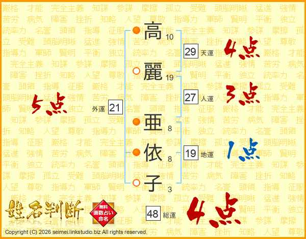 高(10画)麗(19画) 亜(8画)依(8画)子(3画)