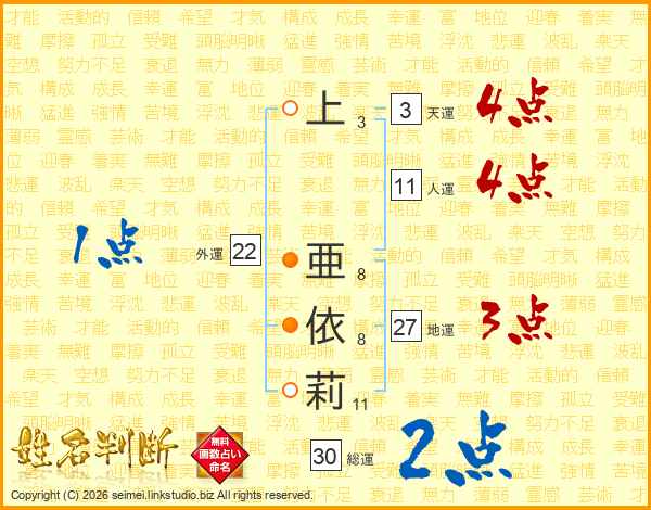 上(3画) 亜(8画)依(8画)莉(11画)