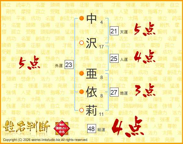 中(4画)沢(17画) 亜(8画)依(8画)莉(11画)