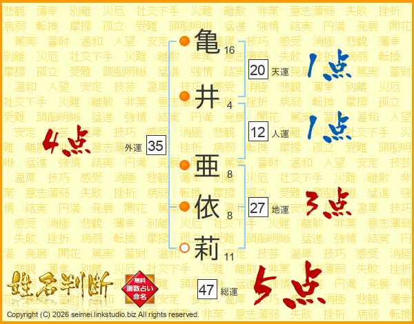 亀(16画)井(4画) 亜(8画)依(8画)莉(11画)