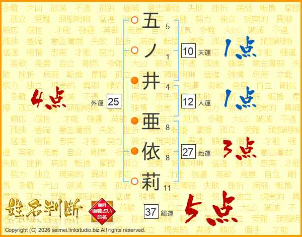 五(5画)ノ(1画)井(4画) 亜(8画)依(8画)莉(11画)