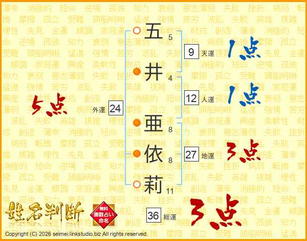 五(5画)井(4画) 亜(8画)依(8画)莉(11画)
