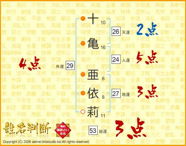 十(10画)亀(16画) 亜(8画)依(8画)莉(11画)