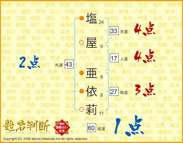 塩屋亜依莉さんの外運は43画の2点!