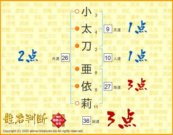 小(3画)太(4画)刀(2画) 亜(8画)依(8画)莉(11画)
