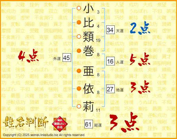小(3画)比(4画)類(19画)巻(8画) 亜(8画)依(8画)莉(11画)