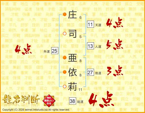 庄(6画)司(5画) 亜(8画)依(8画)莉(11画)