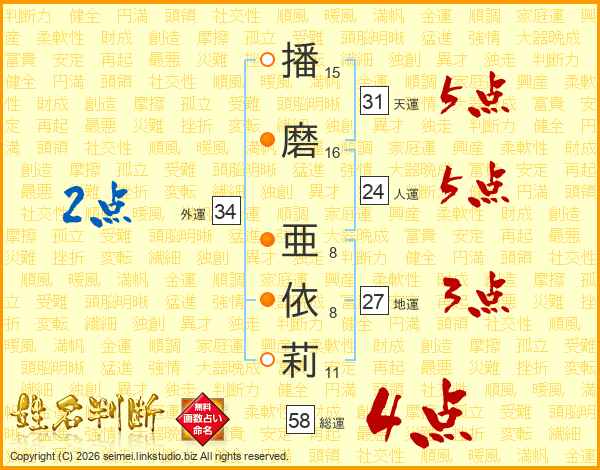 播磨亜依莉さんの総運は58画の4点!