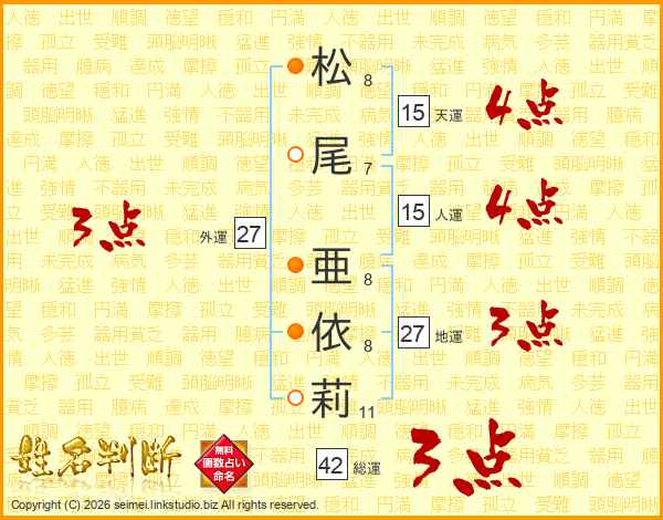 松(8画)尾(7画) 亜(8画)依(8画)莉(11画)