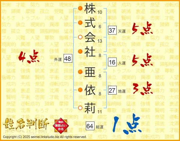 株(10画)式(6画)会(13画)社(8画) 亜(8画)依(8画)莉(11画)