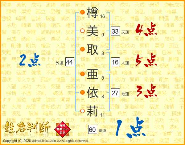樽美取亜依莉さんの天運は33画の4点!