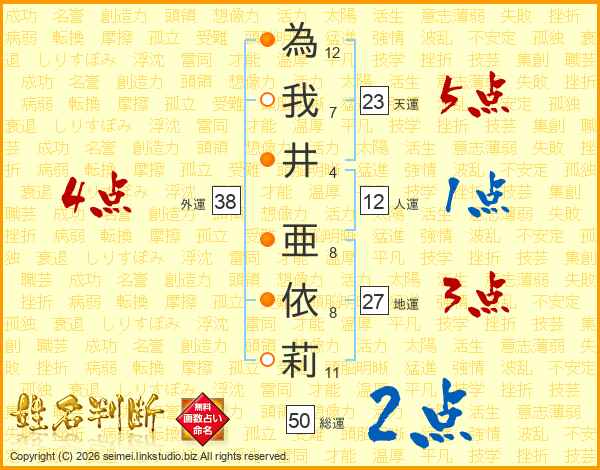 為(12画)我(7画)井(4画) 亜(8画)依(8画)莉(11画)