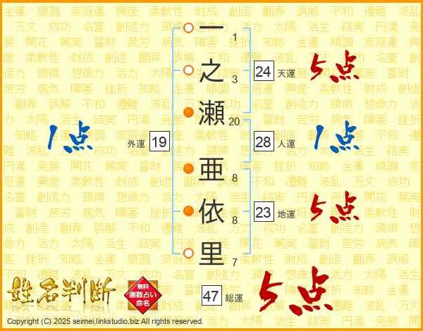 一(1画)之(3画)瀬(20画) 亜(8画)依(8画)里(7画)