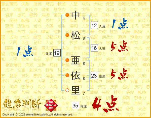 中(4画)松(8画) 亜(8画)依(8画)里(7画)